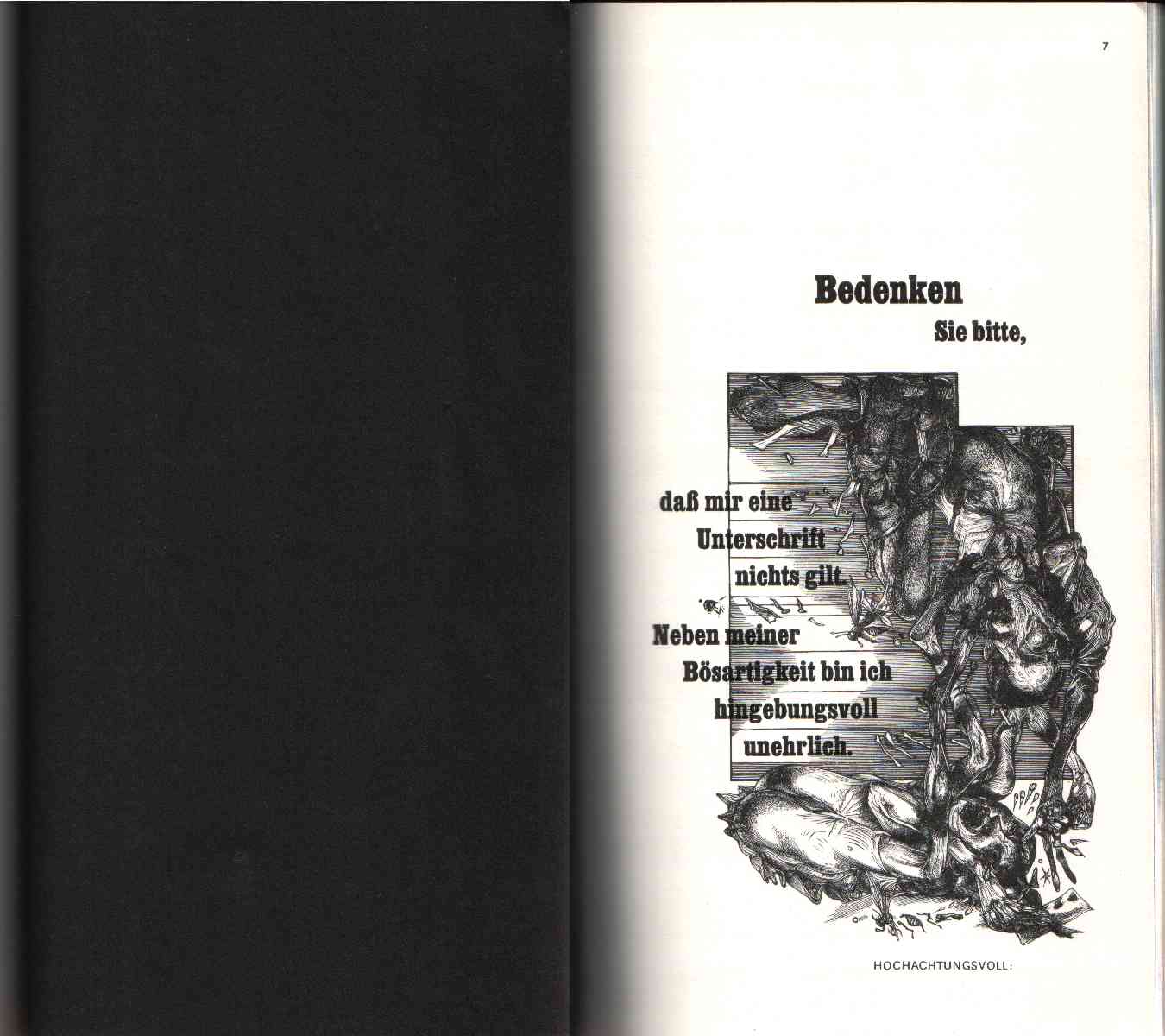 Schwarz angesagt & andere bestechende Gefühle (Doppelseite) Monströse Märchen. Mit Holzstichen von Karl-Georg Hirsch. Graphisches Konzept von Gert Wunderlich Hrsg. im Auftrag der Pirckheimer-Gesellschaft von Jens Henkel. Pressendruck. Leipzig und Gera 1989.